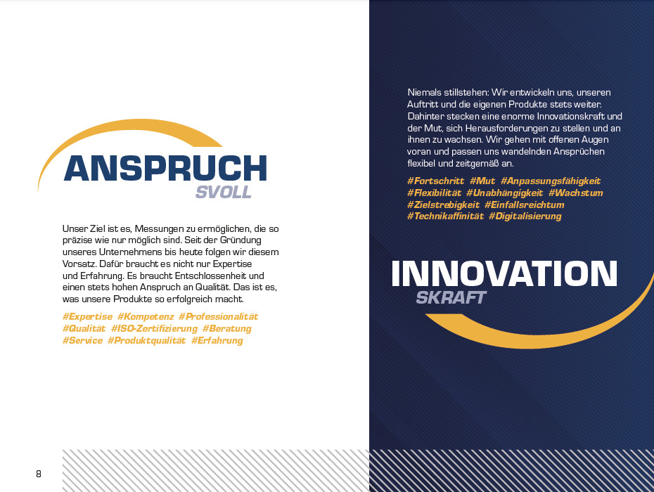 Volle Köpfe, viele Stichpunkte und zahlreiche Eindrücke, die nun im nächsten Schritt weiterverarbeitet werden müssen. Die Notizen werden abgeglichen, nach Relevanz sortiert und in Textform gebracht. Schritt zwei besteht nun darin, den Content visuell aufzubereiten, um schließlich ein ausgestaltetes, mit Beispielen gefülltes Brandbook in den Händen zu halten. Leichte Nervosität vor der Präsentation – haben wir den Kern des Unternehmens richtig erfasst? Erleichterung: PCE findet sich in den beschriebenen Eigenschaften wieder. Nur noch der letzte Feinschliff, dann ist das Brandbook fertig: digital und gedruckt – jederzeit für alle griffbereit, um sich stets vor Augen zu führen, was PCE Instruments so besonders macht. Auf dieser Basis kann nun weiter kommuniziert werden. Immer mit dem Ziel, dem Kunden den Markenkern näherzubringen.