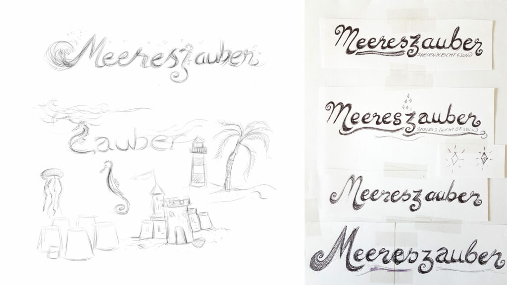 Unsere gemeinsame Reise beginnt mit ersten Logo Ideen. Statt digital Pixel von A nach B zu schieben, skizziert unsere Designerin die ersten Entwürfe per Hand. Für eine erste Präsentation werden diese Entwürfe weiter aufgebreitet und digital feingeschliffen. Jeder einzelne erzählt die Geschichte von Meereszauber auf seine eigene Weise – und jeder hat das Potenzial das neue Logo zu werden. Umso schwerer fällt auch Vivien am Ende die Entscheidung.